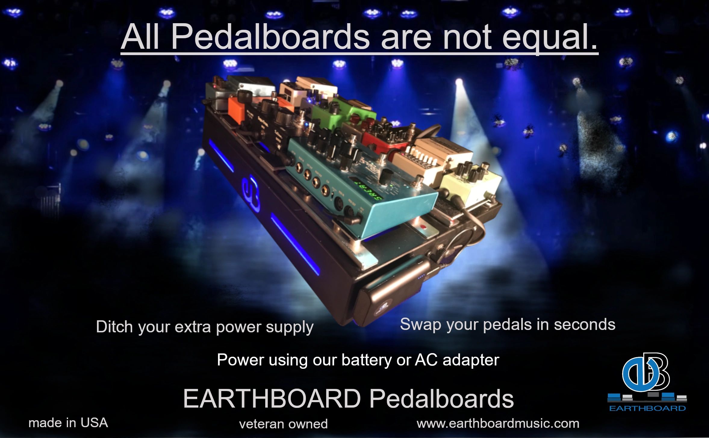 There is simply nothing like this guitar pedalboard. Anywhere. Except here. Rare Earth Magnets + guitar pedals + rechargeable battery + patented rail system = EARTHBOARD. Add LED lights and it becomes waaaay cool. Every player should have an EARTHBOARD with their guitar accessories! (RIght: EBII pedalboard system.)